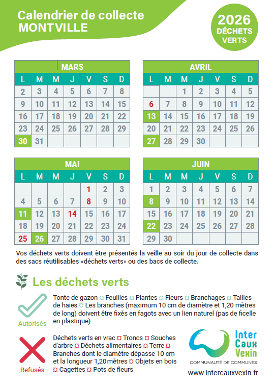 Les collectes en porte-à-porte ont lieu un lundi sur deux, d’avril à novembre. En dehors de cette période, les habitants peuvent déposer leurs déchets verts à la déchetterie de Montville.